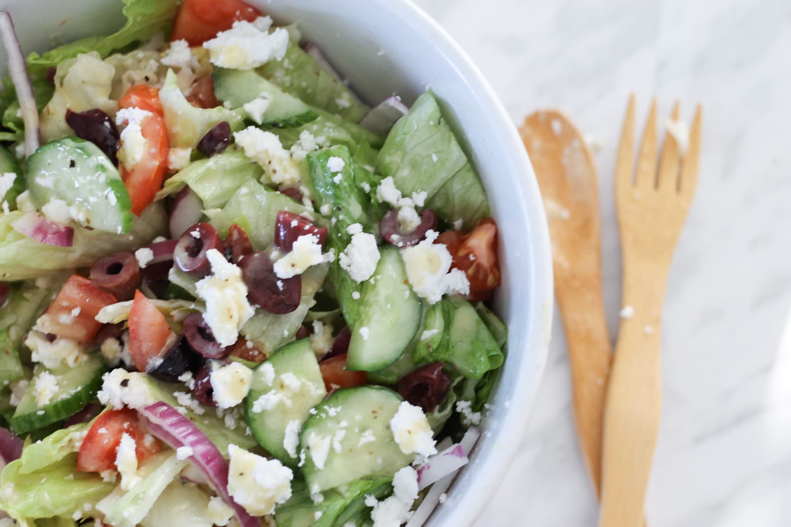 Besides what goes into the salad itself, the dressing you use is the next important addition! You can make my homemade Greek salad dressing which only needs a handful of pantry ingredients to whip up. Or, you can choose to use a store-bought version that you love instead if that’s easier.
