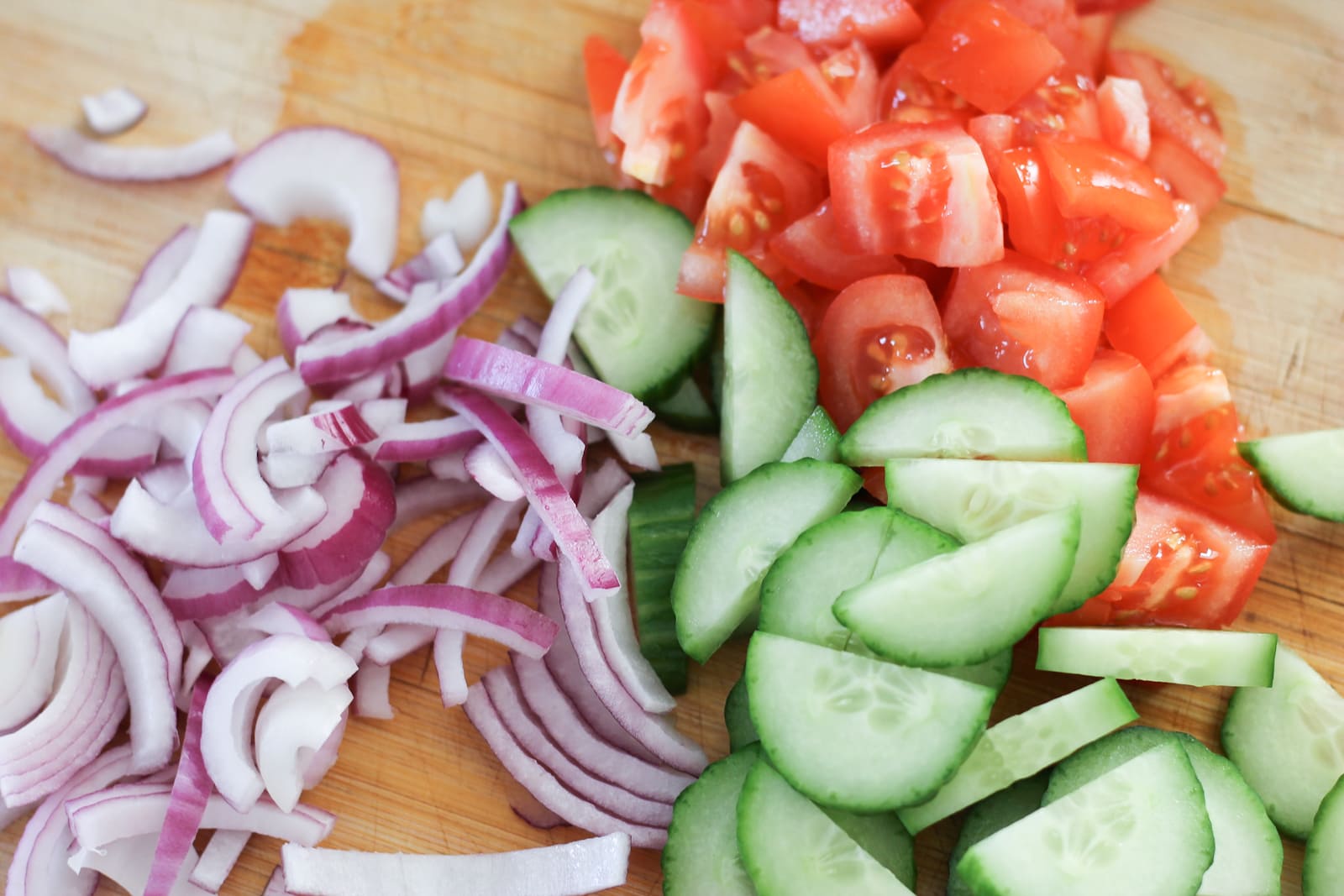 Cut tomatoes into 1/2" pieces, cut cucumber into half moon slices and thinly slice red onions.