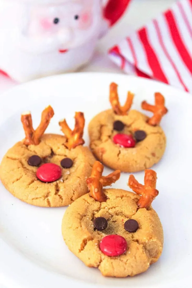 These are your favorite peanut butter cookie but all dressed up with candies and pretzels to make them look like Rudolph! Easy and adorable!